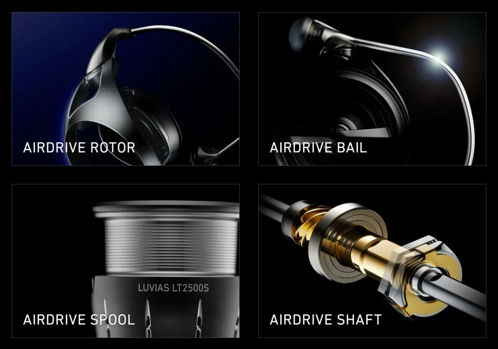 24ルビアスは、ダイワの最新設計思想「エアドライブデザイン」を構成する4つのパーツ(ローター、ベール、スプール、シャフト)をすべて搭載しています。